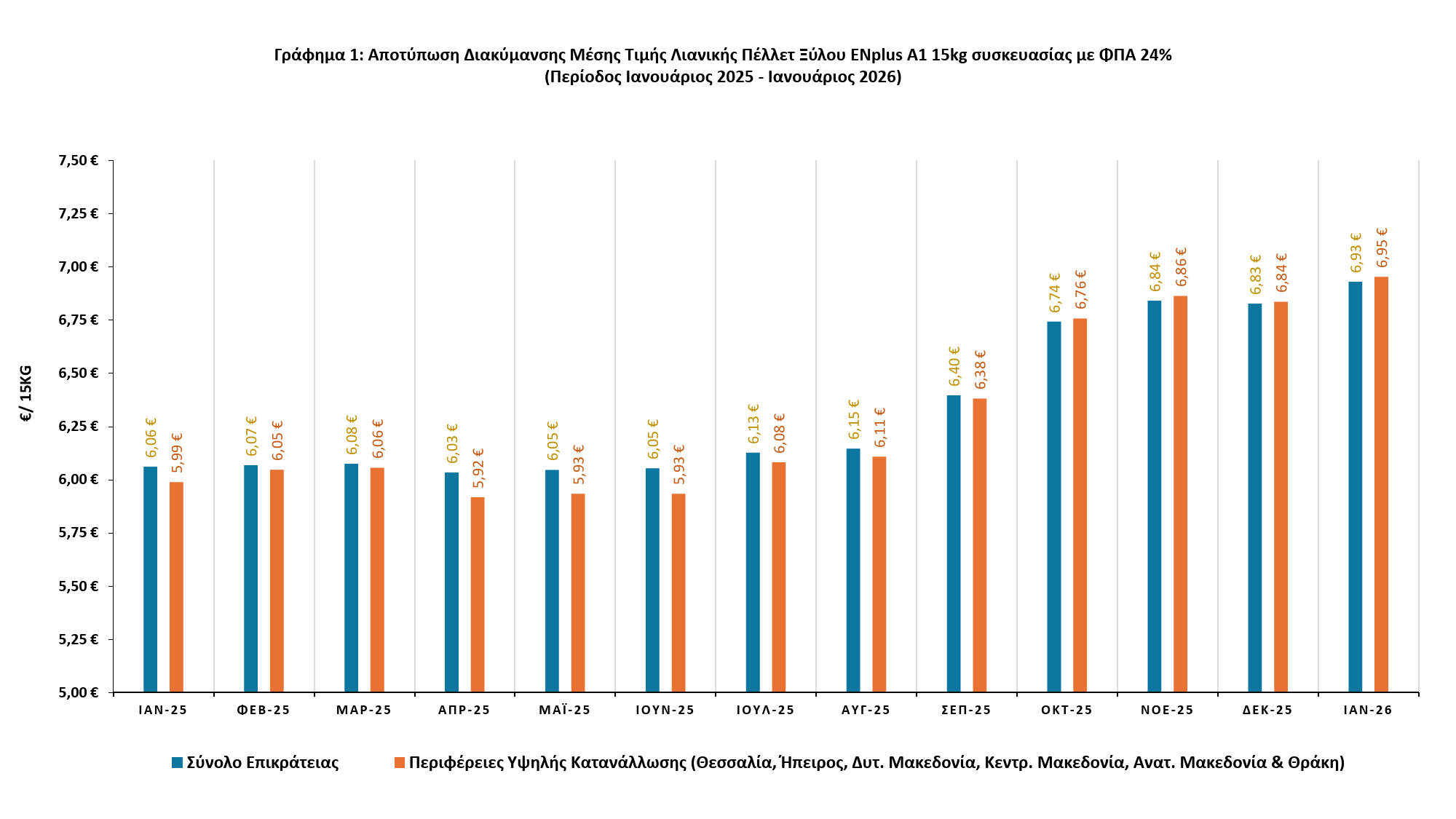 Ολοκληρώθηκε η έρευνα του Δείκτη Τιμών για τη μέση τιμή λιανικής πελεττών ξύλου κλάσης Α1, πιστοποιημένων με το σύστημα ENplus®, για τους μήνες Δεκέμβριο 2025 – Ιανουάριο 2026. Όπως φαίνεται στα Γραφήματα 1 και 2 (15-κιλη συσκευασία και για 1 τόνο προϊόντος αντίστοιχα), οι τιμές βρίσκονται ελαφρώς αυξημένες σε σχέση με τις τιμές του Σεπτεμβρίου 2023: 6,93 €/σακί για την Επικράτεια και 6,95 €/σακί για τις Περιφέρειες Υψηλής Κατανάλωσης (συγκριτικά με 6,87 και 6,84 €/σακί τον Σεπτ. 2023), ως αποτέλεσμα της σταδιακής διαδικασίας κλιμάκωσης των τιμών.