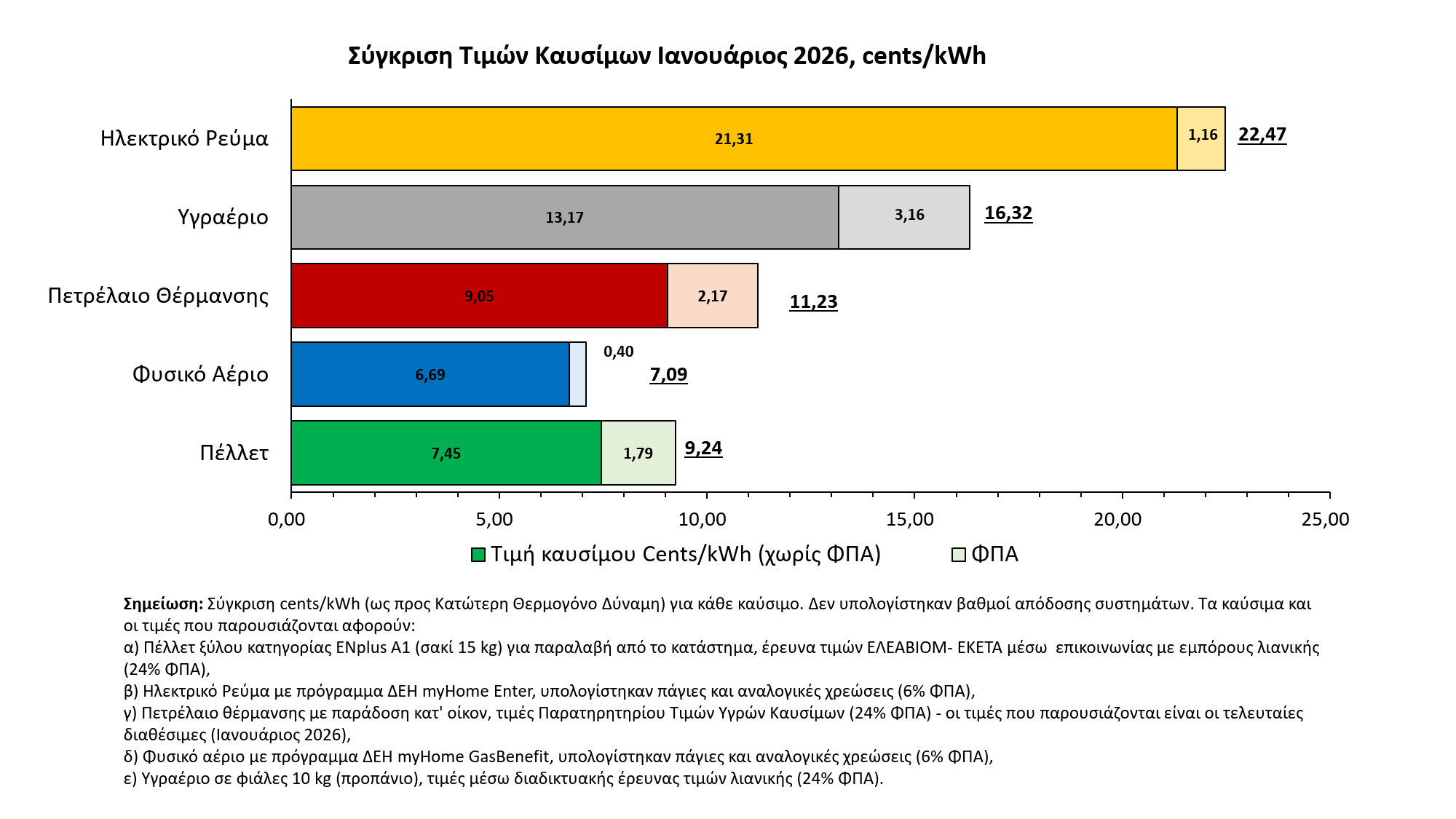 – Στην πορεία των περιόδων θέρμανσης 2024-25 και 2025-26 πραγματοποιείται παράλληλα σύγκριση τιμών καυσίμου και με άλλα αντίστοιχα ενεργειακά προϊόντα σε [cent € / kWh] (π.χ. πετρέλαιο θέρμανσης, φυσικό αέριο, ηλεκτρική ενέργεια, υγραέριο).