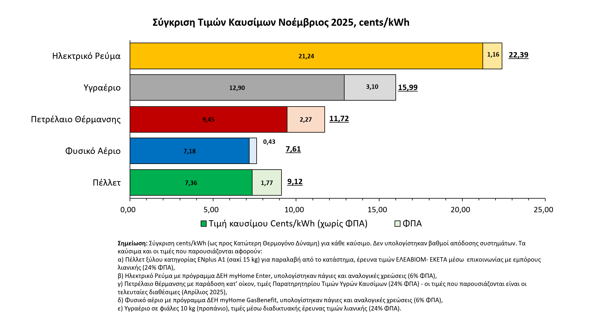 Αναφορικά με την σύγκριση τιμής καυσίμων θέρμανσης για το μήνα Νοέμβριο 2025 (Γράφημα 4), με βάση την κατώτερη θερμογόνο δύναμη κάθε καυσίμου, προκύπτει ότι τα πέλλετ ξύλου έχουν ανταγωνιστικό κόστος σχετικά με άλλες λύσεις θέρμανσης, στα 9,12 cents/kWh, συμπεριλαμβανομένου ΦΠΑ 24%. Οι τιμές των ορυκτών καυσίμων (πετρέλαιο θέρμανσης, φυσικό αέριο και υγραέριο) έχουν παραμείνει σε χαμηλά για την εποχή επίπεδα λόγω των υψηλών θερμοκρασιών που σημειώνονται στην ελληνική επικράτεια, γεγονός που αναμένεται να αλλάξει με την πάροδο της χειμερινής σεζόν.