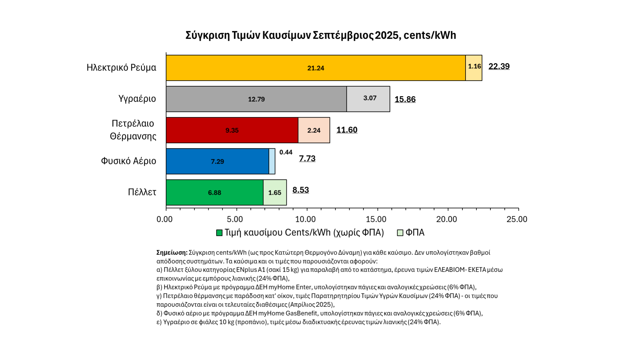 Αναφορικά με την σύγκριση τιμής καυσίμων θέρμανσης για το μήνα Σεπτέμβριο 2025 (Γράφημα 4), με βάση την κατώτερη θερμογόνο δύναμη κάθε καυσίμου, προκύπτει ότι τα πέλλετ ξύλου έχουν συγκρίσιμο κόστος με το φυσικό αέριο, στα 8,53 cents/kWh, συμπεριλαμβανομένου ΦΠΑ 24%. Η τιμή του Φυσικού αερίου αναμένεται να σημειώσει τις κανονικές αυξήσεις λόγω ζήτησης κατά τους επόμενους μήνες, μειώνοντας την διαφορά ανάμεσα στις τιμές των δύο προϊόντων.